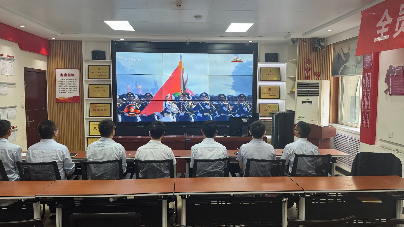 歷史燭照未來,精神永續傳承。為深切緬懷在抗日戰爭中英勇獻身的革命先烈,大力弘揚偉大的抗戰精神,引導全體黨員、職工銘記光輝歷史、堅定理想信念、強化責任擔當,9月3日,機運工區黨支部組織開展了“銘記歷史偉業,傳承紅色基因”主題黨日活動,組織全體黨員集中觀看紀念中國人民抗日戰爭暨世界反法西斯戰爭勝利80周年閱兵儀式現場直播。上午九時整,機運工區全體黨懷著無比崇敬與激動的心情,目光齊聚屏幕。伴隨著激昂雄壯的國歌奏響,鮮艷的五星紅旗在天安門廣場冉冉升起,大家心潮澎湃,肅然起敬。隨后,規模宏大、氣勢磅礴的閱兵式正式開始。屏幕上,一個個整齊劃一、威武雄壯的徒步方隊,邁著鏗鏘有力、撼人心魄的步伐走過檢閱臺,堅毅的眼神、挺拔的身姿,充分展現了新時代軍人聽黨指揮的忠誠品格和能打勝仗的過硬本領;一列列代表著國家科技實力與國防現代化建設最新成果的裝備方隊,鐵流滾滾,氣勢如虹,尖端武器依次亮相,彰顯了捍衛國家主權、安全、發展利益的堅定決心與強大能力;雄鷹呼嘯,劃破長空,戰機編隊以精準的隊形和磅礴的氣勢接受檢閱,描繪出壯美的藍天畫卷,宣示著捍衛國家領空安全的鋼鐵意志。整個閱兵過程,秩序井然、威武雄壯、氣勢恢宏,生動詮釋了人民軍隊“聽黨指揮、能打勝仗、作風優良”的強軍目標,全方位展示了在黨的堅強領導下,國家日益強大的綜合國力和維護世界和平的堅定信念。屏幕前,黨員們全神貫注,無不被這震撼人心的場面所感染,民族自豪感與榮譽感油然而生,現場不時響起由衷的贊嘆和熱烈的掌聲。通過本次“銘記歷史偉業,傳承紅色基因”主題黨日活動,機運工區黨支部全體黨員經歷了一次深刻的精神淬煉與思想升華。大家的歷史使命感、民族自豪感、崗位責任感得到顯著增強,紛紛表示以更加飽滿昂揚的精神狀態、更加求真務實的工作作風、更加開拓創新的進取意識,恪盡職守,銳意進取,全力以赴保障原煤運輸安全高效,為工區及公司的持續高質量發展貢獻全部力量!
